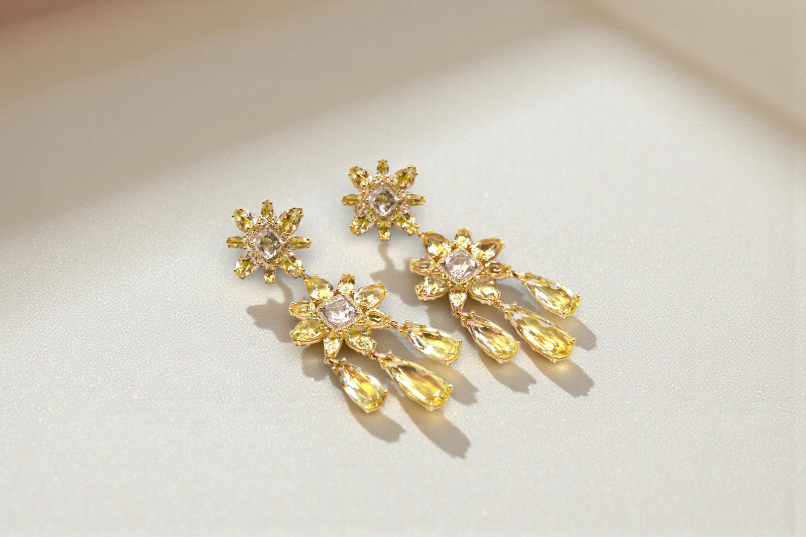 14KT White Gold Blue Topaz Green Amethyst Diamond Large Amaryllis Earrings