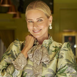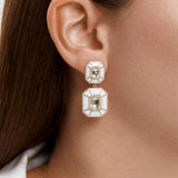 A bright new addition to our deco collection for summer, the 14KT Gold Gemstone Enamel Diamond Deco Earrings come in three combinations of gemstone and enamel: blue topaz with turquoise enamel, pink topaz with pink enamel, and green amethyst with white enamel. Anne wears her 14KT Yellow Gold Green Amethyst White Enamel Diamond Deco Earrings with everything from spring florals to her signature Canadian tuxedo look.