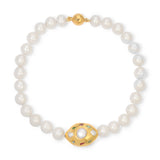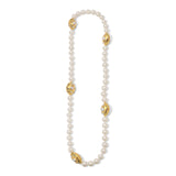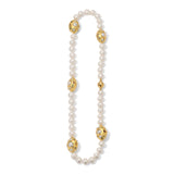 This elegant necklace is available in three versatile lengths—15.5, 28, and 34 inches—to suit your personal style. Each piece features lustrous pearls ranging from 12 to 13mm, paired with 18kt gold-plated accents adorned with gemstones and pearls.