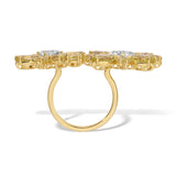 The Luxe Double Amaryllis Flower Ring showcases a sculpted double-flower design in 14KT yellow gold, featuring luminous lemon quartz, white topaz and diamond accents, creating a striking yet wearable statement piece. The harmonious blend of vibrant color and brilliant stones makes it perfect for special occasions or everyday elegance.
